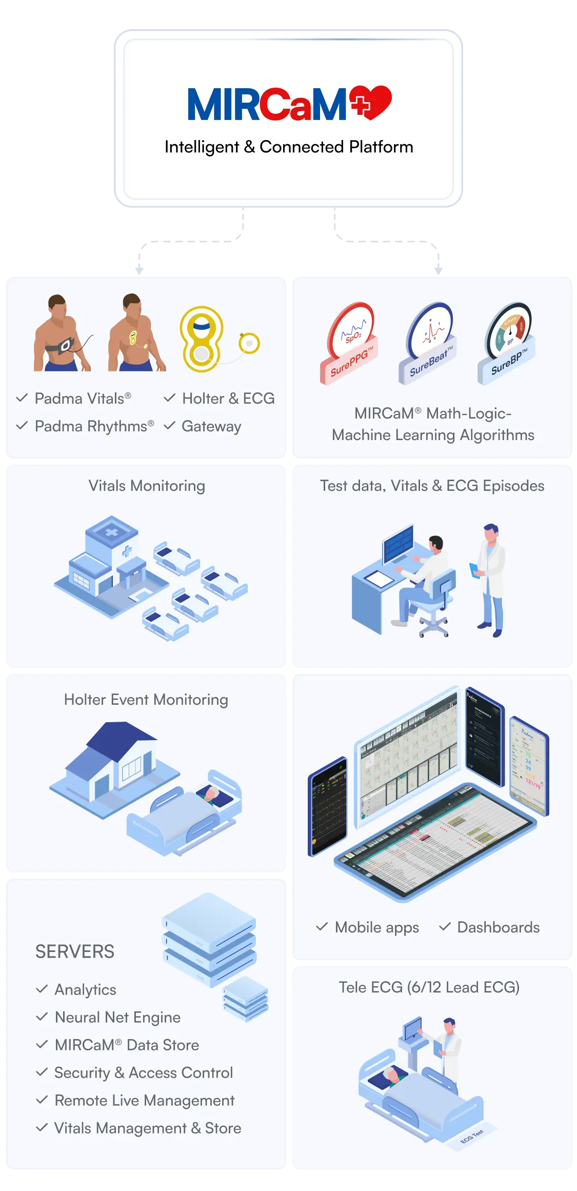 Powered by a combination of Math-Logic-ML Algorithms, the platform hosts a suite of hardware, software at firmware level, server, communication protocol and applications along with clinical-grade algorithms to collaborate results from all locations centrally on the cloud.